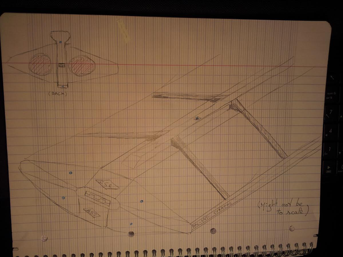C'est ainsi que grâce à de majestueux dessins de ma part (notons d'ailleurs la perspective d'un fort bel aloi *touss*), et à un rendu 3D du sieur Kop, je vous présente le numéro 1 de l'export batuléen : le destroyer lance-missiles de classe Omega :